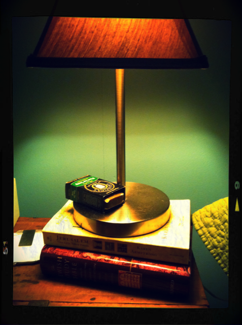 Under a lamp by the bed.