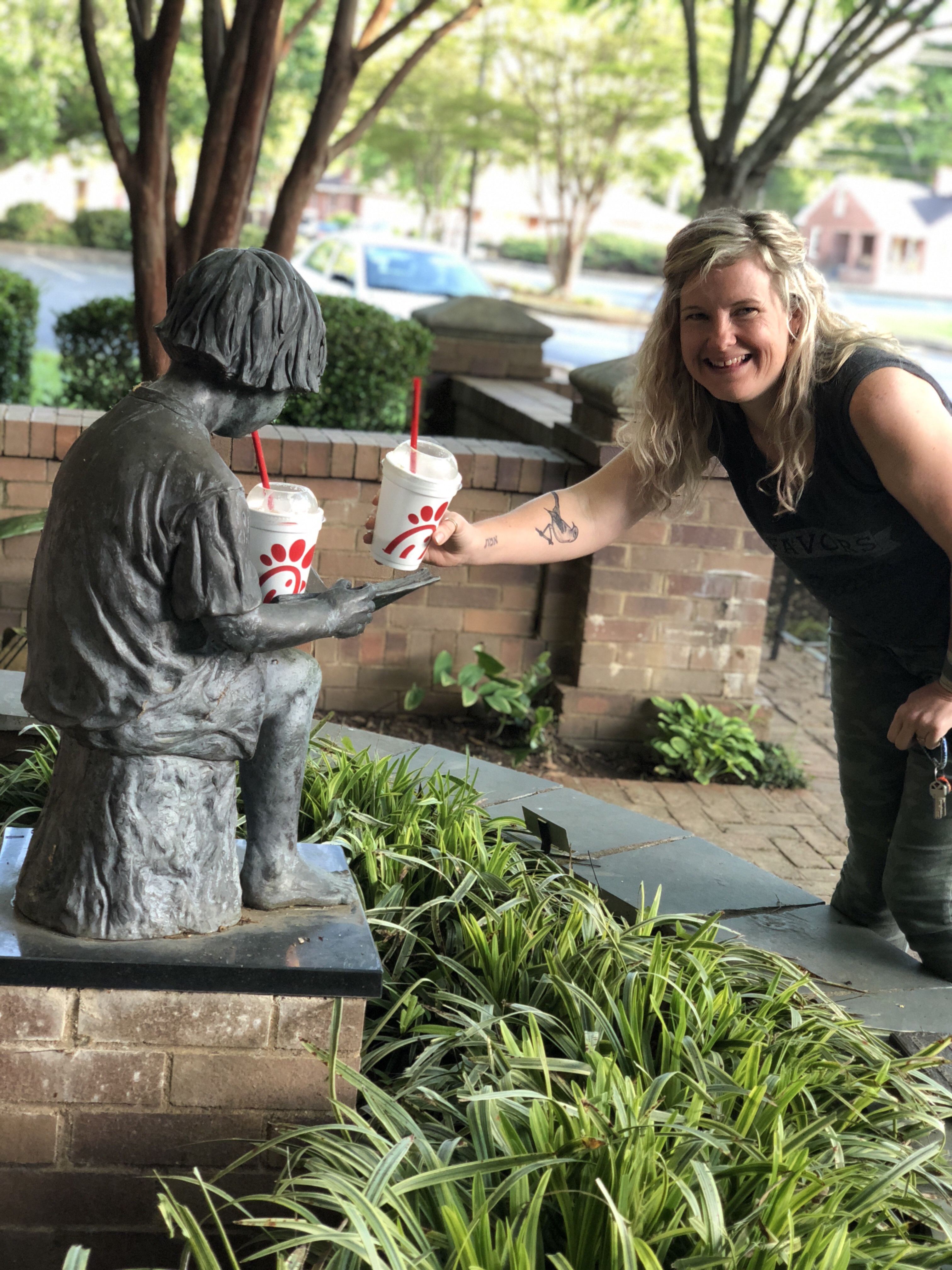 I try to rotate through all of the kids periodically with one on one dates and little outings – not always something spectacular – just a little special time. Last week it was London’s turn and we ended up taking our milkshakes to a little outdoor park area. Where London found it hilarious to offer her milkshake to the statue and to pose silly photos.